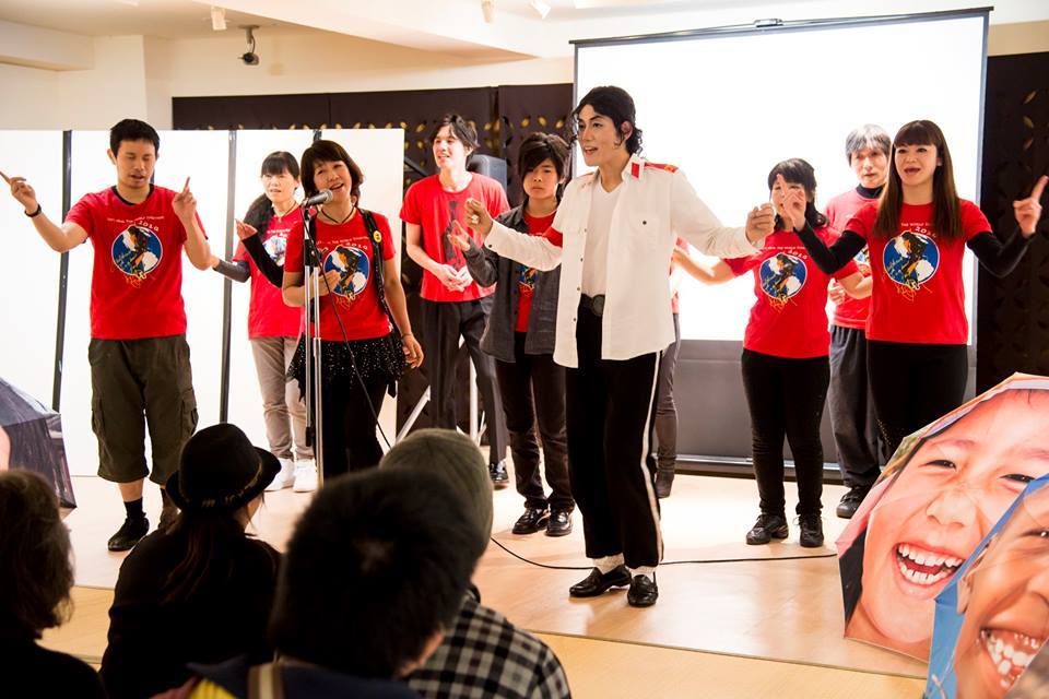 3/5(土)東日本橋わなびば333で開催された東北応援文化祭~ごちゃまぜ社会バンザイ~にマイケルはメッセージを未来に伝えるアースデイwithマイケルがMERRYの笑顔の傘と一緒に出演しました。 このイベントは、東日本大震災で宮城県東松島に出張中に津波に遭ったTomoCoさんが、ご自身の再起とともにくるみボタンアーティストとして被災された方々を支援し、その過程で出会った人たちと集まり、震災を忘れないようにと開催されました。 TomoCoさんの震災の体験や記憶についての語りからはじまり、いろんな音楽や芸術や手作りのものや思いを持ち寄り、お互いにその時間を楽しみ、震災の恐ろしさを思い出し、人の絆の大切さを確かめ合いました。去年2回共演させて頂いた、筋ジストロフィーと闘う歌手の小澤綾子さんも出演してステージの最後を締めくくりました。 僕がTomoCoさんと初めてお会いしたのは、震災から半年以上も経った時でしたが、その日は震災以降初めて外出が出来た日だったそうです。 僕たちもマイケル・パフォーマンスとともに活動の内容と東北への思いを伝えさせていただきました。 大のマイケルファンで、ダウン症をもちながら活躍する有名な書家の金澤翔子さんも、一緒にパフォーマーとして出演してくれました。 震災から5年が経ち、これから大事なのは、翔子さんもテーマにされている「共に生きる」ということだと思います。 すべてのいろんな立場の人たちが共生できる社会。 東日本大震災に学んだ私たちだから、それができる。 そして世界を平和に変えてゆくことができるのだと思います。 それが、「ごちゃまぜ社会バンザイ」なんだと思いました。 世界中の被災地や紛争地の子どもたちの笑顔が地球をMERRYにする。 笑顔の傘にこめた思いにも通じるものを感じました。 ここでお会いしたみなさまと、よりよい世界にしてゆきたいと思います。